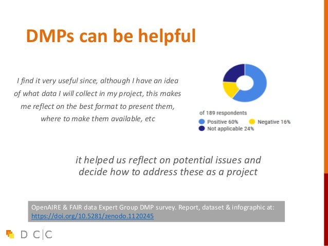 13. 13. DMPs can be helpful it helped us reflect on potential issues and decide how to address these as a project I find it very useful since, although I have an idea of what data I will collect in my project, this makes me reflect on the best format to present them, where to make them available, etc OpenAIRE & FAIR data Expert Group DMP survey. Report, dataset & infographic at: https://doi.org/10.5281/zenodo.1120245