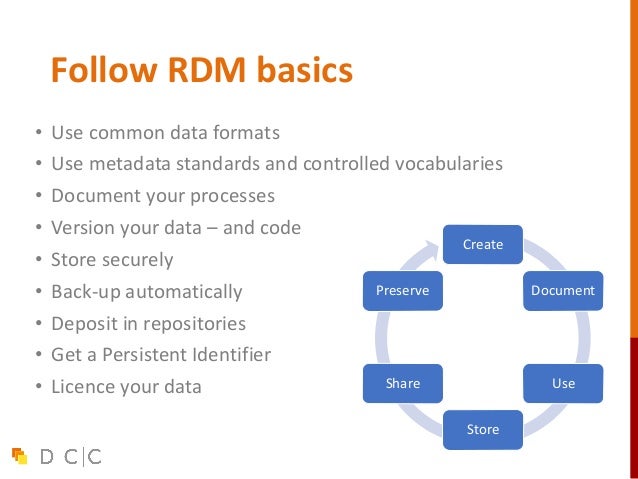 16. 16. Follow RDM basics • Use common data formats • Use metadata standards and controlled vocabularies • Document your processes • Version your data – and code • Store securely • Back-up automatically • Deposit in repositories • Get a Persistent Identifier • Licence your data Create Document Use Store Share Preserve