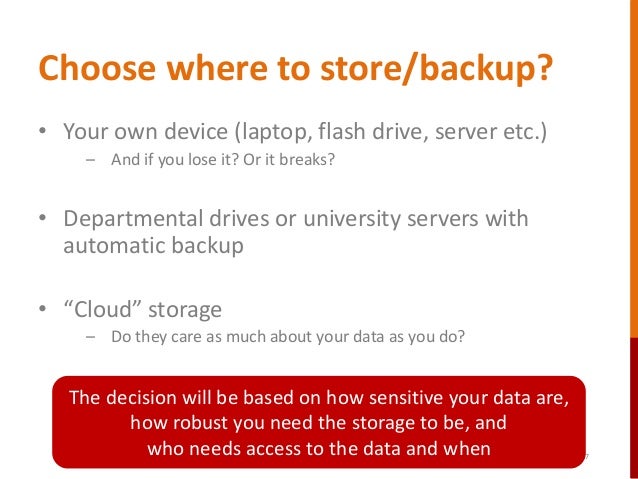 17. 17. 17 Choose where to store/backup? • Your own device (laptop, flash drive, server etc.) – And if you lose it? Or it breaks? • Departmental drives or university servers with automatic backup • “Cloud” storage – Do they care as much about your data as you do? The decision will be based on how sensitive your data are, how robust you need the storage to be, and who needs access to the data and when