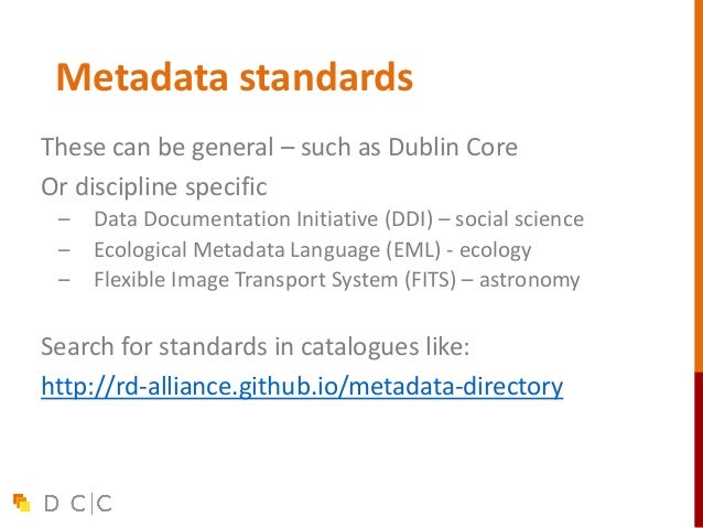21. 21. Metadata standards These can be general – such as Dublin Core Or discipline specific – Data Documentation Initiative (DDI) – social science – Ecological Metadata Language (EML) - ecology – Flexible Image Transport System (FITS) – astronomy Search for standards in catalogues like: http://rd-alliance.github.io/metadata-directory