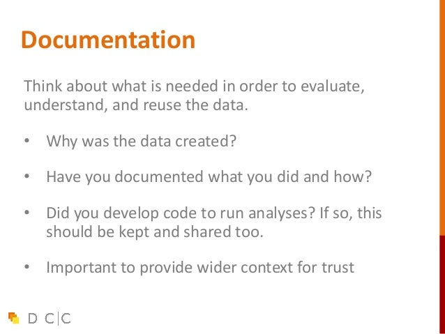 22. 22. Documentation Think about what is needed in order to evaluate, understand, and reuse the data. • Why was the data created? • Have you documented what you did and how? • Did you develop code to run analyses? If so, this should be kept and shared too. • Important to provide wider context for trust