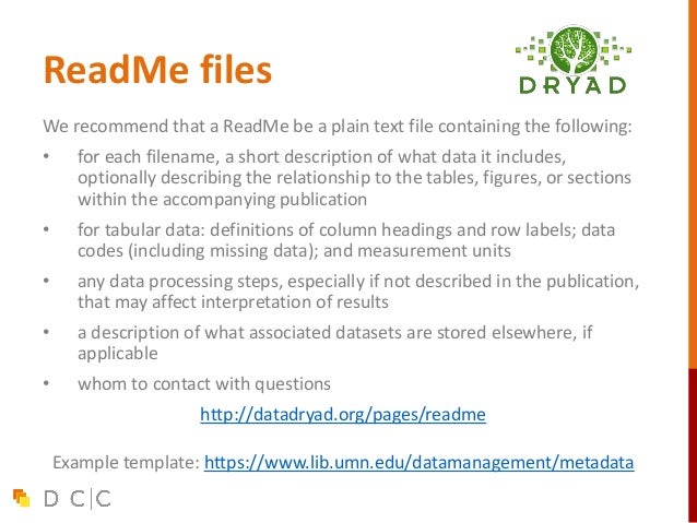 23. 23. ReadMe files We recommend that a ReadMe be a plain text file containing the following: • for each filename, a short description of what data it includes, optionally describing the relationship to the tables, figures, or sections within the accompanying publication • for tabular data: definitions of column headings and row labels; data codes (including missing data); and measurement units • any data processing steps, especially if not described in the publication, that may affect interpretation of results • a description of what associated datasets are stored elsewhere, if applicable • whom to contact with questions http://datadryad.org/pages/readme Example template: https://www.lib.umn.edu/datamanagement/metadata