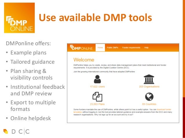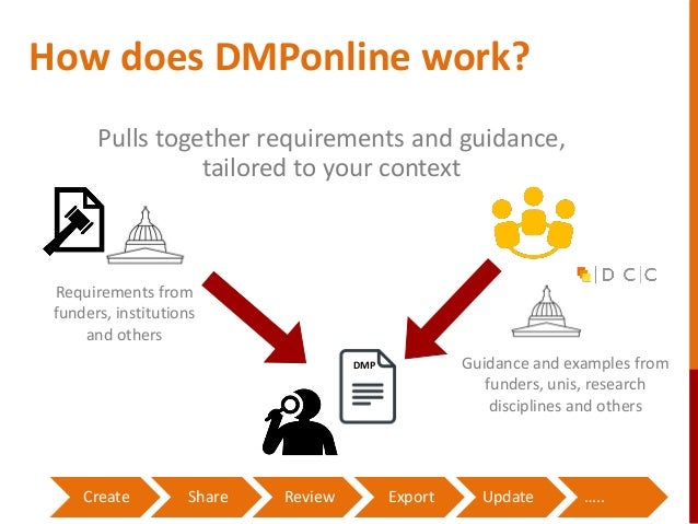 27. 27. 27 How does DMPonline work? Pulls together requirements and guidance, tailored to your context Guidance and examples from funders, unis, research disciplines and others DMP Requirements from funders, institutions and others Create Share Review Export Update …..