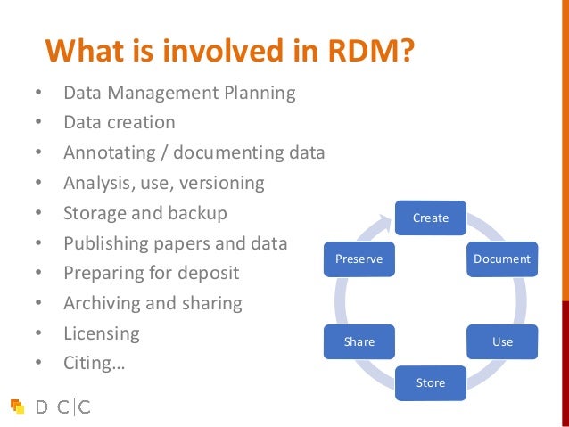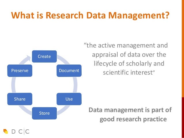 3. 3. What is Research Data Management? Create Document Use Store Share Preserve “the active management and appraisal of data over the lifecycle of scholarly and scientific interest” Data management is part of good research practice