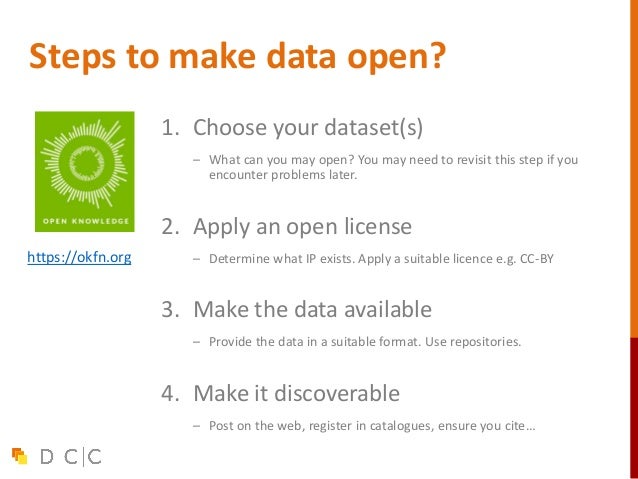 30. 30. Steps to make data open? 1. Choose your dataset(s) – What can you may open? You may need to revisit this step if you encounter problems later. 2. Apply an open license – Determine what IP exists. Apply a suitable licence e.g. CC-BY 3. Make the data available – Provide the data in a suitable format. Use repositories. 4. Make it discoverable – Post on the web, register in catalogues, ensure you cite… https://okfn.org