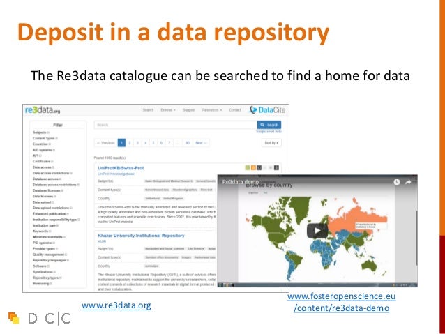 32. 32. Deposit in a data repository http://databib.org www.re3data.org The Re3data catalogue can be searched to find a home for data www.fosteropenscience.eu /content/re3data-demo