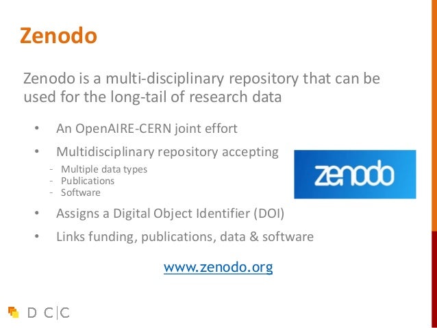 34. 34. Zenodo is a multi-disciplinary repository that can be used for the long-tail of research data • An OpenAIRE-CERN joint effort • Multidisciplinary repository accepting – Multiple data types – Publications – Software • Assigns a Digital Object Identifier (DOI) • Links funding, publications, data & software www.zenodo.org Zenodo