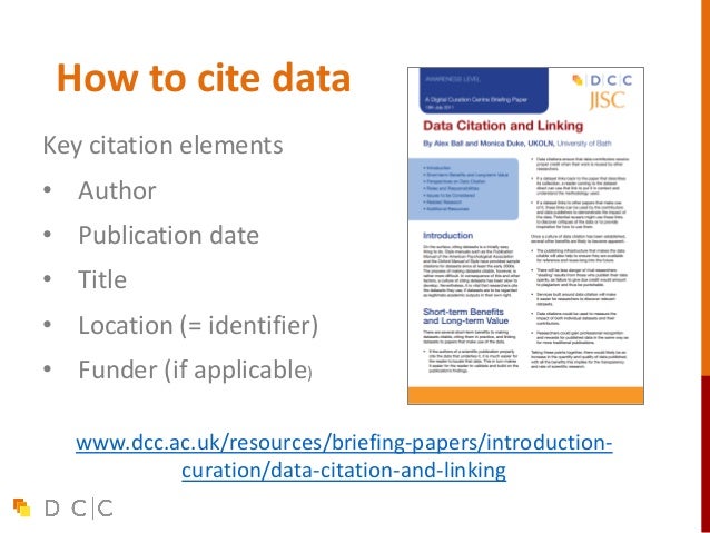 37. 37. How to cite data www.dcc.ac.uk/resources/briefing-papers/introduction- curation/data-citation-and-linking Key citation elements • Author • Publication date • Title • Location (= identifier) • Funder (if applicable)