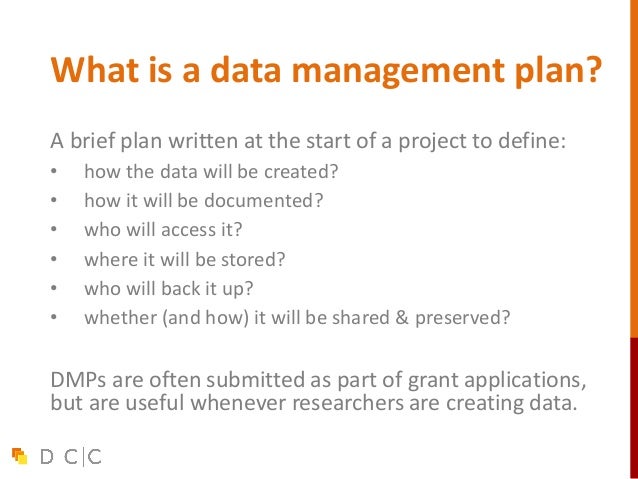 5. 5. What is a data management plan? A brief plan written at the start of a project to define: • how the data will be created? • how it will be documented? • who will access it? • where it will be stored? • who will back it up? • whether (and how) it will be shared & preserved? DMPs are often submitted as part of grant applications, but are useful whenever researchers are creating data.