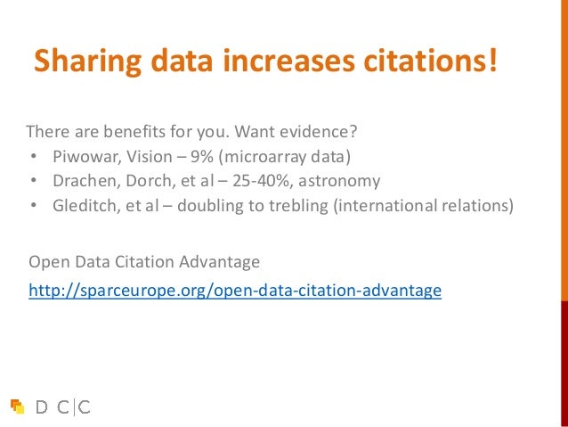8. 8. Sharing data increases citations! There are benefits for you. Want evidence? • Piwowar, Vision – 9% (microarray data) • Drachen, Dorch, et al – 25-40%, astronomy • Gleditch, et al – doubling to trebling (international relations) Open Data Citation Advantage http://sparceurope.org/open-data-citation-advantage