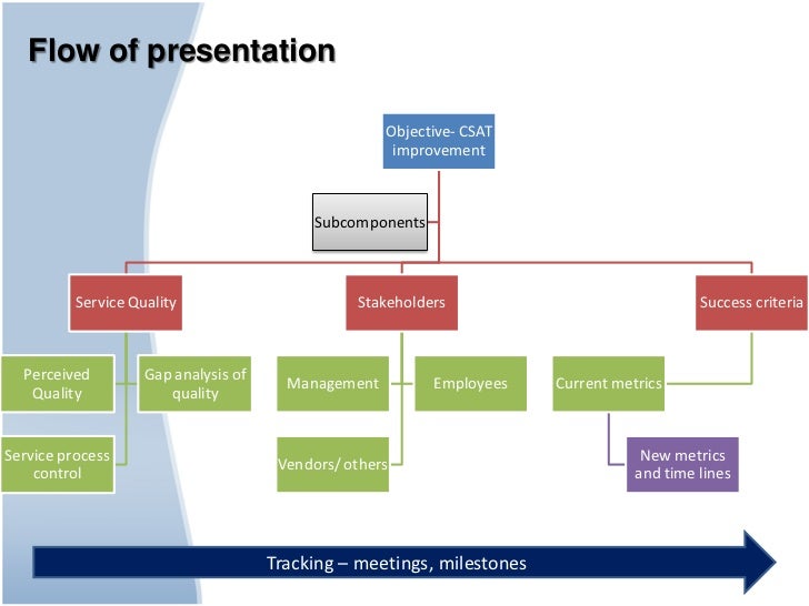 2. 2. Flow of presentation Objective- CSAT improvement Subcomponents Service Quality Stakeholders Success criteria Perceived Gap analysis of Management Employees Current metrics Quality qualityService process New metrics Vendors/ others control and time lines Tracking – meetings, milestones
