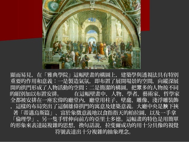 10. 10. 顯而易見,在「雅典學院」這幅壁畫的構圖上,建築學與透視法具有特別 重要的作用和意義:一是製造氣氛,即布置了展開場景的空間,向縱深展 開的拱門形成了人物活動的空間;二是簡潔的構圖,把 多的人物按不同眾 的組別加以布置安排。   在這幅壁畫中,人物、學者、藝術家、哲學家 全都被安排在一座宏偉的廳堂內,廳堂用柱子、壁龕、雕像、淺浮雕裝飾 ,這樣的布局突出了這個雄偉拱門的寓意及建築意義。大廳中央是 下挾脥 著「蒂邁烏斯篇」、富於象徵意義地以食指指天的柏拉圖,以及一手拿 「倫理學」、另一隻手臂伸向前方的亞里士多德。這幅畫的特色是用簡單 的形象來表達最複雜的思想,換句話說,拉斐爾成功的用十分具像的視覺 符號表達出十分複雜的抽象理念。