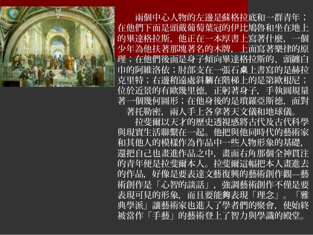 11. 11.   兩個中心人物的左邊是蘇格拉底和一群青年; 在他們下面是頭戴葡萄葉冠的伊比鳩魯和坐在地上 的畢達格拉斯,他正在一本厚書上寫著什麼,一個 少年為他扶著那塊著名的木牌,上面寫著樂律的原 理;在他們後面是身子傾向畢達格拉斯的、頭纏白 巾的阿維洛依;肘部支在一張石 上書寫的是赫拉桌 克里特;右邊稍遠處斜 在階梯上的是第歐根尼;躺 位於近景的有歐幾里德,正躬著身子,手執圓規量 著一個幾何圖形;在他身後的是瑣羅亞斯德,面對 著托勒密,兩人手上各拿著天文儀和地球儀。   拉斐爾以天才的歷史透視感將古代及古代科學 與現實生活聯繫在一起。他把與他同時代的藝術家 和其他人的模樣作為作品中一些人物形象的基礎, 還把自己也畫進作品之中,畫面右角那個全神貫注 的青年便是拉斐爾本人。拉斐爾這幅把本人畫進去 的作品,好像是要表達文藝復興的藝術創作觀—藝 術創作是「心智的談話」,強調藝術創作不僅是要 表現可見的形象,而且要能 表現「理念」。「雅夠 典學派」讓藝術家也進入了學者們的聚會,使始終 被當作「手藝」的藝術登上了智力與學識的殿堂。