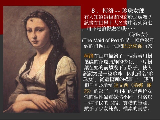 12. 12. 8 、柯洛 -- 珍珠女郎 有人知道這幅畫的玄妙之處 ?嗎 該畫在世界十大名畫中名列第七 ,可不是浪得虛名哦…… 《珍珠女》 (The Maid of Pearl) 是一幅色彩雅 致的肖像画。法國巴比松派画家 柯洛在画中描繪了一個戴着用樹 葉 的花環頭飾的少女,一片樹编 葉在 的前 投下了影子,使人她 额 誤認 是一粒珍珠,因此得名“珍为 珠女”。從這幅画的構圖上,我們 似乎可以看到達文西《蒙娜 · 丽 莎》的影子,所不同的是 位女两 性的個性氣質截然不同。柯洛以 一種平民的心態、質樸的筆觸, 予了少女 真、樸素的美感。赋 纯