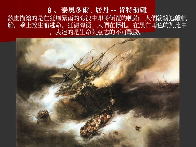 13. 13. 9 、泰奧多爾 . 居丹 -- 肯特海難 該畫描繪的是在狂風暴雨的海浪中即將傾覆的帆船,人們紛紛逃離帆 船,乘上救生船逃命,狂濤洶湧,人們在 扎。在黑白兩色的對比中掙 ,表達的是生命與意志的不可戰勝。
