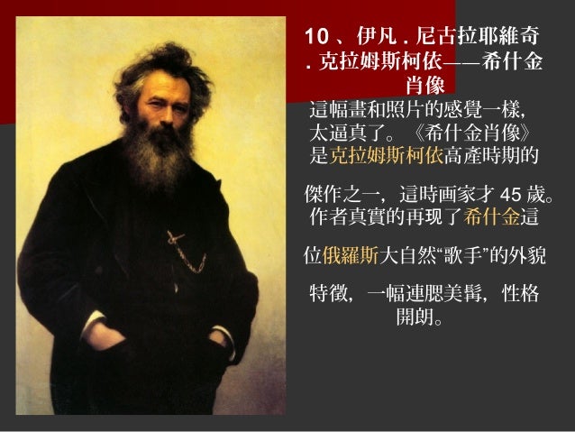 14. 14. 10 、伊凡 . 尼古拉耶維奇 . 克拉姆斯柯依——希什金 肖像 這幅畫和照片的感覺一樣, 太逼真了。《希什金肖像》 是克拉姆斯柯依高產時期的 傑作之一,這時画家才 45 歲。 作者真實的再 了现 希什金這 位俄羅斯大自然“歌手”的外貌 特徵,一幅連腮美髯,性格 開朗。