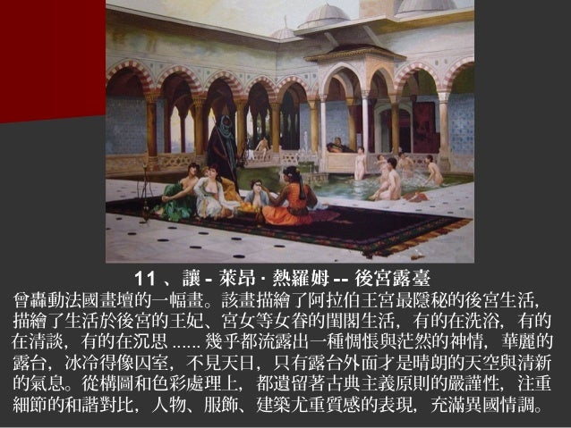 15. 15. 11 、讓 - 萊昂 · 熱羅姆 -- 後宮露臺 曾轟動法國畫壇的一幅畫。該畫描繪了阿拉伯王宮最隱秘的後宮生活, 描繪了生活於後宮的王妃、宮女等女眷的閨閣生活,有的在洗浴,有的 在清談,有的在 思沉 ...... 幾乎都流露出一種惆悵與茫然的神情,華麗的 露台,冰冷得像囚室,不見天日,只有露台外面才是晴朗的天空與清新 的氣息。從構圖和色彩處理上,都遺留著古典主義原則的嚴謹性,注重 細節的和諧對比,人物、服飾、建築尤重質感的表現,充滿異國情調。