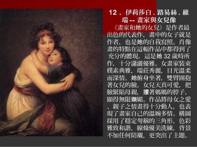16. 16. 12 、伊莉莎白 . 路易絲 . 維 瑞 -- 畫家與女兒像 《畫家和 的女兒》是作者最她 出色的代表作,畫中的女子就是 作者,也是 的自我寫照。肖像她 畫的特點在這幅作品中都得到了 充分的體現。這是她 32 歲時所 作,十分瀟灑優雅。女畫家裝束 樸素典雅,端莊秀麗,目光溫柔 而深情。 俯身坐著,雙臂圍抱她 著女兒的臉。女兒天真可愛,把 臉緊貼母親, 著媽媽的脖子,摟 顯得無限 媚。作品將母女之愛嫵 、親子之情畫得十分動人,也表 現了畫家自己的溫婉多情。構圖 採用了穩定 稱的三角形,色彩勻 雅致和諧,線條優美洗練,背景 不加任何陪襯,更突出了主題。
