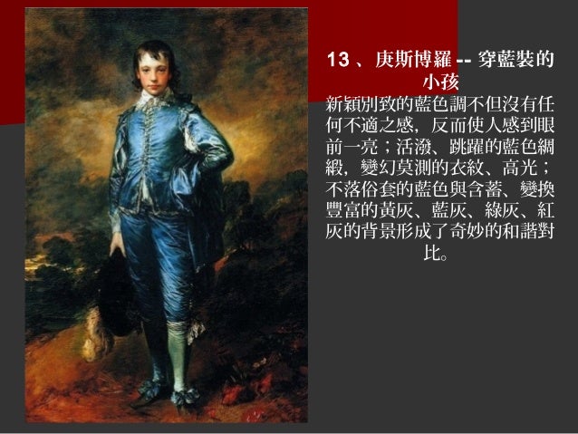 17. 17. 13 、庚斯博羅 -- 穿藍裝的 小孩 新穎別致的藍色調不但沒有任 何不適之感,反而使人感到眼 前一亮;活潑、跳躍的藍色綢 緞,變幻莫測的衣紋、高光; 不落俗套的藍色與含蓄、變換 豐富的黃灰、藍灰、綠灰、紅 灰的背景形成了奇妙的和諧對 比。