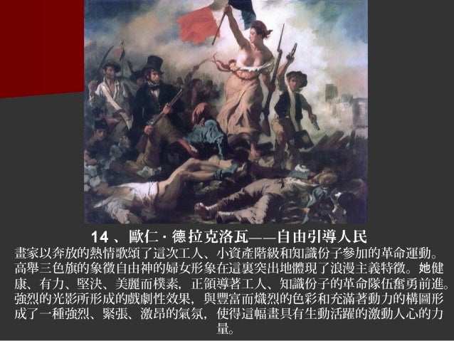 18. 18. 14 、歐仁 · 拉克洛瓦——自由引導人民德 畫家以奔放的熱情歌頌了這次工人、小資產階級和知識份子參加的革命運動。 高舉三色旗的象徵自由神的婦女形象在這裏突出地體現了浪漫主義特徵。 健她 康、有力、堅決、美麗而樸素,正領導著工人、知識份子的革命隊伍奮勇前進。 強烈的光影所形成的戲劇性效果,與豐富而熾烈的色彩和充滿著動力的構圖形 成了一種強烈、緊張、激昂的氣氛,使得這幅畫具有生動活躍的激動人心的力 量。