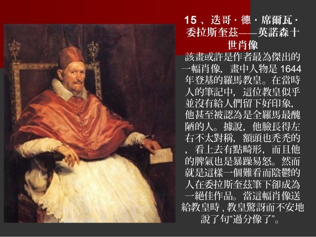 19. 19. 15 、迭哥 · 德 · 席爾瓦 · 委拉斯奎茲——英諾森十 世肖像 該畫或許是作者最為傑出的 一幅肖像,畫中人物是 1644 年登基的羅馬教皇。在當時 人的筆記中,這位教皇似乎 並沒有給人們留下好印象, 他甚至被認為是全羅馬最醜 陋的人。據說,他臉長得左 右不太對稱,額頭也禿禿的 ,看上去有點畸形,而且他 的脾氣也是暴躁易怒。然而 就是這樣一個難看而陰鬱的 人在委拉斯奎茲筆下卻成為 一絕佳作品。當這幅肖像送 給教皇時 , 教皇驚訝而不安地 說了句“過分像了”。