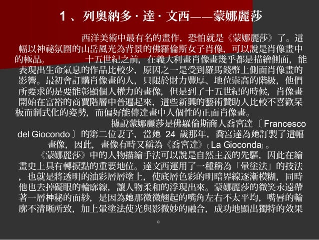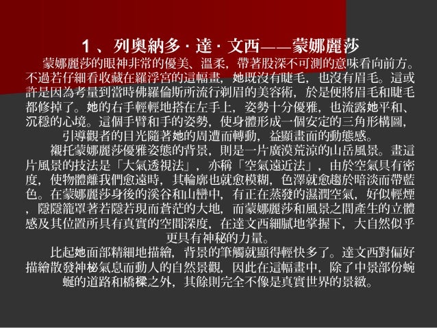 3. 3. 1 、列奧納多 · 達 · 文西——蒙娜麗莎   蒙娜麗莎的眼神非常的優美、溫柔,帶著股深不可測的意味看向前方。 不過若仔細看收藏在羅浮宮的這幅畫, 既沒有睫毛,也沒有眉毛。這或她 許是因為考量到當時佛羅倫斯所流行剃眉的美容術,於是便將眉毛和睫毛 都修掉了。 的右手輕輕地搭在左手上,姿勢十分優雅,也流露 平和、她 她 穩的心境。這個手臂和手的姿勢,使身體形成一個安定的三角形構圖,沉 引導觀者的目光隨著 的周遭而轉動,益顯畫面的動態感。她   襯托蒙娜麗莎優雅姿態的背景,則是一片廣漠荒涼的山岳風景。畫這 片風景的技法是「大氣透視法」,亦稱「空氣遠近法」,由於空氣具有密 度,使物體離我們愈遠時,其輪廓也就愈模糊,色澤就愈趨於暗淡而帶藍 色。在蒙娜麗莎身後的溪谷和山巒中,有正在蒸發的濕潤空氣,好似輕煙 ,隱隱籠罩著若隱若現而蒼茫的大地,而蒙娜麗莎和風景之間產生的立體 感及其位置所具有真實的空間深度,在達文西細膩地掌握下,大自然似乎 更具有神秘的力量。   比起 面部精細地描繪,背景的筆觸就顯得輕快多了。達文西對偏好她 描繪散發神 氣息而動人的自然景觀,因此在這幅畫中,除了中景部份蜿柲 蜒的道路和橋 之外,其餘則完全不像是真實世界的景緻。樑