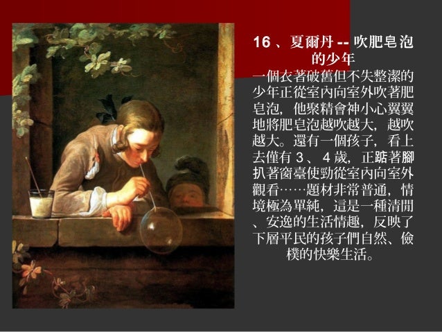 20. 20. 16 、夏爾丹 -- 吹肥 泡皂 的少年 一個衣著破舊但不失整潔的 少年正從室內向室外吹著肥 皂泡,他聚精會神小心翼翼 地將肥皂泡越吹越大,越吹 越大。還有一個孩子,看上 去僅有 3 、 4 歲,正 著踮 腳 著窗臺使勁從室內向室外扒 觀看……題材非常普通,情 境極為單純,這是一種清閒 、安逸的生活情趣,反映了 下層平民的孩子們自然、儉 樸的快樂生活。
