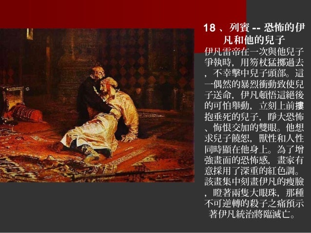 23. 23. 18 、列賓 -- 恐怖的伊 凡和他的兒子 伊凡雷帝在一次與他兒子 爭執時,用笏杖猛擲過去 ,不幸擊中兒子頭部。這 一偶然的暴烈衝動致使兒 子送命,伊凡頓悟這絕後 的可怕舉動,立刻上前摟 抱垂死的兒子,睜大恐怖 、悔恨交加的雙眼。他想 求兒子饒恕,獸性和人性 同時顯在他身上。為了增 強畫面的恐怖感,畫家有 意採用了深重的紅色調。 該畫集中刻畫伊凡的瘦臉 ,瞪著兩隻大眼珠,那種 不可逆轉的殺子之痛預示 著伊凡統治將臨滅亡。