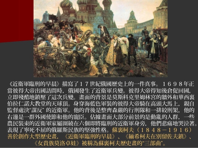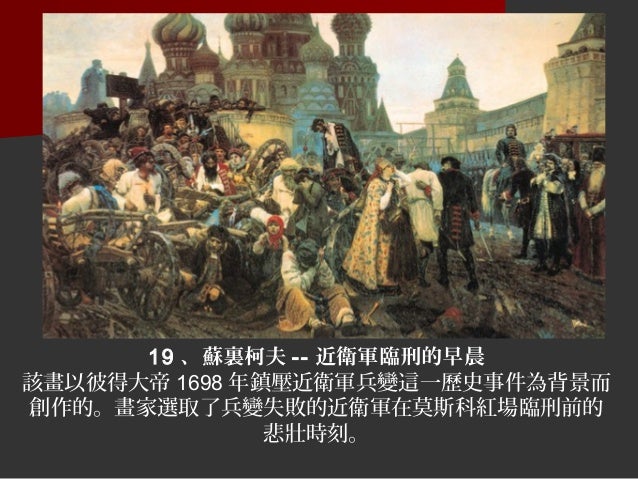 24. 24. 19 、蘇裏柯夫 -- 近衛軍臨刑的早晨 該畫以彼得大帝 1698 年鎮壓近衛軍兵變這一歷史事件為背景而 創作的。畫家選取了兵變失敗的近衛軍在莫斯科紅場臨刑前的 悲壯時刻。