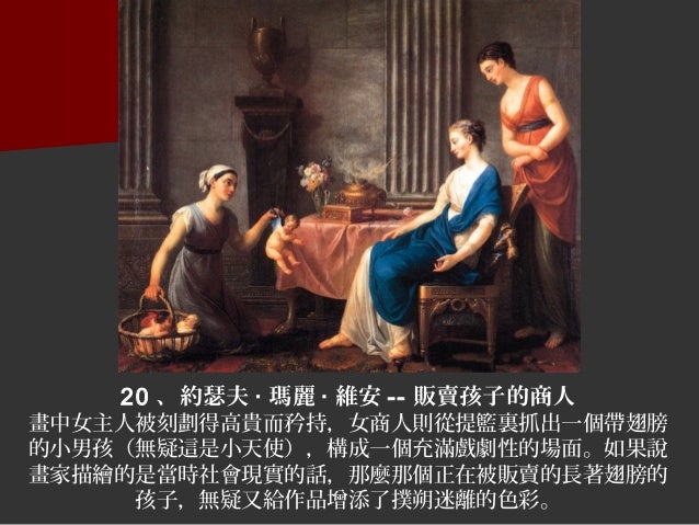 26. 26. 20 、約瑟夫 · 瑪麗 · 維安 -- 販賣孩子的商人 畫中女主人被刻劃得高貴而矜持,女商人則從提籃裏抓出一個帶翅膀 的小男孩(無疑這是小天使),構成一個充滿戲劇性的場面。如果說 畫家描繪的是當時社會現實的話,那麼那個正在被販賣的長著翅膀的 孩子,無疑又給作品增添了撲朔迷離的色彩。