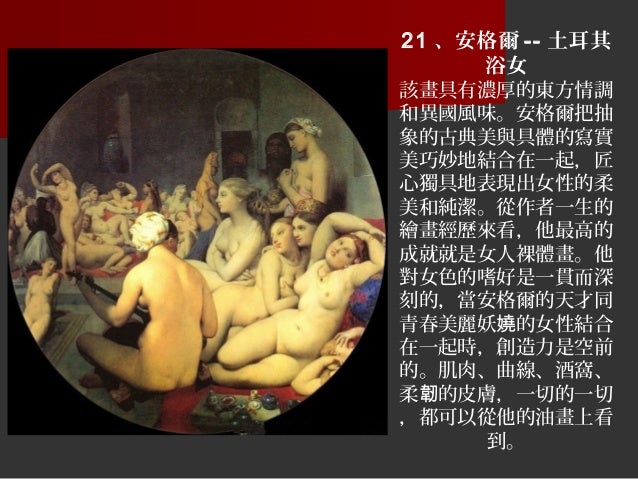 27. 27. 21 、安格爾 -- 土耳其 浴女 該畫具有濃厚的東方情調 和異國風味。安格爾把抽 象的古典美與具體的寫實 美巧妙地結合在一起,匠 心獨具地表現出女性的柔 美和純潔。從作者一生的 繪畫經歷來看,他最高的 成就就是女人裸體畫。他 對女色的嗜好是一貫而深 刻的,當安格爾的天才同 青春美麗妖 的女性結合嬈 在一起時,創造力是空前 的。肌肉、曲線、酒窩、 柔 的皮膚,一切的一切韌 ,都可以從他的油畫上看 到。