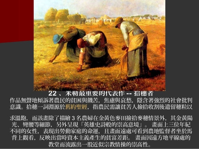 28. 28. 22 、米勒最重要的代表作 -- 拾穗者 作品無聲地傾訴著農民的貧困與饑苦,焦慮與哀愁,隱含著強烈的社會批判 意識。拾穗一詞淵源於舊約聖經,指農民需讓貧苦人撿拾收割後遺留穗粒以 求溫飽,而該畫除了描繪 3 名農婦在金黃色麥田撿拾麥穗情景外,其金黃陽 光、彎腰等細節,另外呈現「英雄史詩般的崇高意境」。 畫面上三位年紀 不同的女性,表現出勞動家庭的命運,且畫面遠處可看到農地監督者坐於馬 背上觀看,反映出當時資本主義產生的貧富差距。 畫面因遠方地平線處的 教堂而流露出一股近似宗教情操的崇高性。
