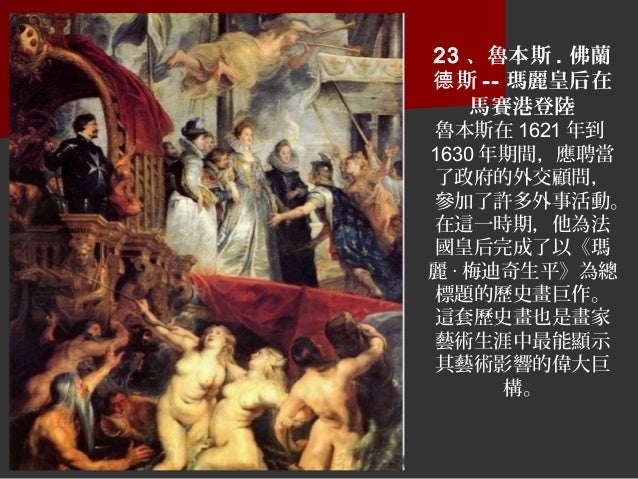 29. 29. 23 、魯本斯 . 佛蘭 斯德 -- 瑪麗皇后在 馬賽港登陸 魯本斯在 1621 年到 1630 年期間,應聘當 了政府的外交顧問, 參加了許多外事活動。 在這一時期,他為法 國皇后完成了以《瑪 麗 · 梅迪奇生平》為總 標題的歷史畫巨作。 這套歷史畫也是畫家 藝術生涯中最能顯示 其藝術影響的偉大巨 構。