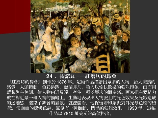 30. 30. 24 、雷諾瓦——紅磨坊的舞會 《 磨坊的舞會》創作於红 1876 年。這幅作品描繪出 多的人物,給人擁擠的眾 感覺。人頭攢動,色彩跳躍,熱鬧非凡,給人以愉快歡樂的強烈印象。画面用 藍紫 主色調,使人物由近及遠,產生一種多層次的節奏感。画家把主要精力为 放在對近景一 人物的描繪上,生動地表 出人物臉上的光色效果及光影造成组 现 的迷離感, 染了舞會的氣氛。就總體看,他保留着印象派對外光与色斑的留渲 戀,使画面的總體色調、氣氛有一種 動、閃爍的强烈效果。颤 1990 年,這幅 作品以 7810 萬美元的高價售出。