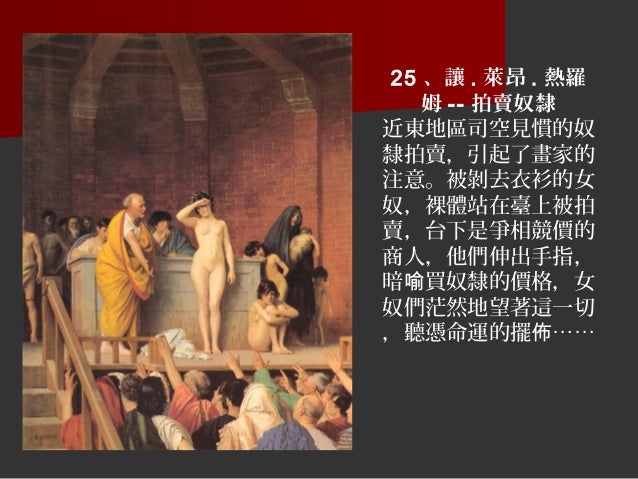 31. 31. 25 、讓 . 萊昂 . 熱羅 姆 -- 拍賣奴隸 近東地區司空見慣的奴 隸拍賣,引起了畫家的 注意。被剝去衣衫的女 奴,裸體站在臺上被拍 賣,台下是爭相競價的 商人,他們伸出手指, 暗 買奴隸的價格,女喻 奴們茫然地望著這一切 ,聽憑命運的擺 ……佈