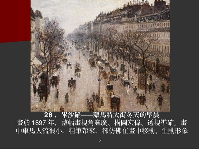 32. 32. 26 、畢沙羅——蒙馬特大街冬天的早晨 畫於 1897 年,整幅畫視角 廣、構圖宏偉、透視準確。畫寬 中車馬人流很小,粗筆帶來,卻仿佛在畫中移動、生動形象 。