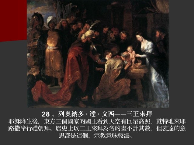 34. 34. 28 、列奧納多 · 達 · 文西——三王來拜 耶穌降生後,東方三個國家的國王看到天空有巨星高照,就特地來耶 路撒冷行禮朝拜。歷史上以三王來拜為名的畫不計其數,但表達的意 思都是這個,宗教意味較濃。
