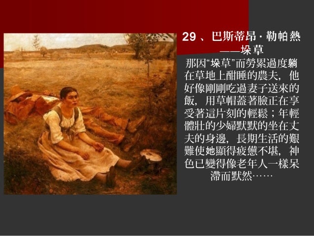 35. 35. 29 、巴斯蒂昂 · 勒 熱帕 —— 草垛 那因“ 草”而勞累過度垛 躺 在草地上酣睡的農夫,他 好像剛剛吃過妻子送來的 飯,用草帽蓋著臉正在享 受著這片刻的輕鬆;年輕 體壯的少婦默默的坐在丈 夫的身邊,長期生活的艱 難使 顯得疲憊不堪,神她 色已變得像老年人一樣呆 滯而默然……