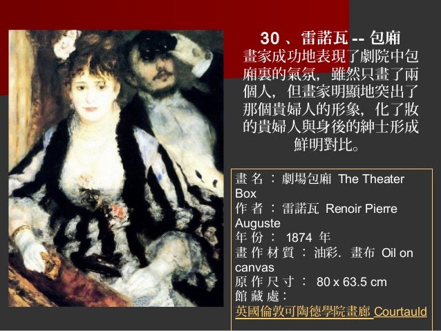 36. 36. 30 、雷諾瓦 -- 包廂 畫家成功地表現了劇院中包 廂裏的氣氛,雖然只畫了兩 個人,但畫家明顯地突出了 那個貴婦人的形象,化了妝 的貴婦人與身後的紳士形成 鮮明對比。 畫 名 : 劇場包廂 The Theater Box 作 者 : 雷諾瓦 Renoir Pierre Auguste 年 份 : 1874 年 畫 作 材 質 : 油彩.畫布 Oil on canvas 原 作 尺 寸 : 80 x 63.5 cm 館 藏 處: 英國倫敦可陶德學院畫廊 Courtauld