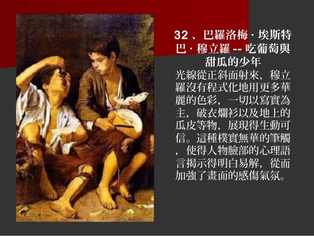 38. 38. 32 、巴羅洛梅 · 埃斯特 巴 · 穆立羅 -- 吃葡萄與 甜瓜的少年 光線從正斜面射來,穆立 羅沒有程式化地用更多華 麗的色彩,一切以寫實為 主,破衣爛衫以及地上的 瓜皮等物,展現得生動可 信。這種樸實無華的筆觸 ,使得人物臉部的心理語 言揭示得明白易解,從而 加強了畫面的感傷氣氛。