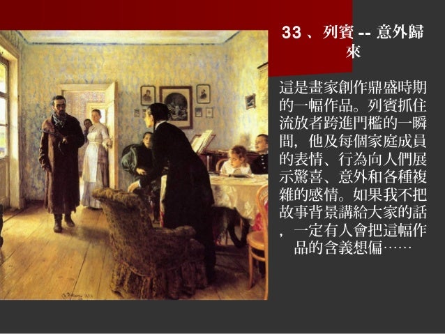 39. 39. 33 、列賓 -- 意外歸 來 這是畫家創作鼎盛時期 的一幅作品。列賓抓住 流放者跨進門檻的一瞬 間,他及每個家庭成員 的表情、行為向人們展 示驚喜、意外和各種複 雜的感情。如果我不把 故事背景講給大家的話 ,一定有人會把這幅作 品的含義想偏……