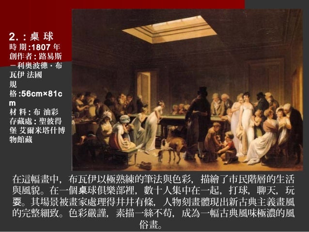 4. 4. 在這幅畫中,布瓦伊以極熟練的筆法與色彩,描繪了市民階層的生活 與風貌。在一個 球俱樂部裡,數十人集中在一起,打球,聊天,玩桌 。其場景被畫家處理得井井有條,人物刻畫體現出新古典主義畫風耍 的完整細致。色彩嚴謹,素描一絲不苟,成為一幅古典風味極濃的風 俗畫。 2. : 球桌 時 期 :1807 年 創作者 : 路易斯 -利奧波德 · 布 瓦伊 法國 規 格 :56cm×81c m 材 料 : 布 油彩 存藏處 : 聖彼得 堡 艾爾米塔什博 物館藏