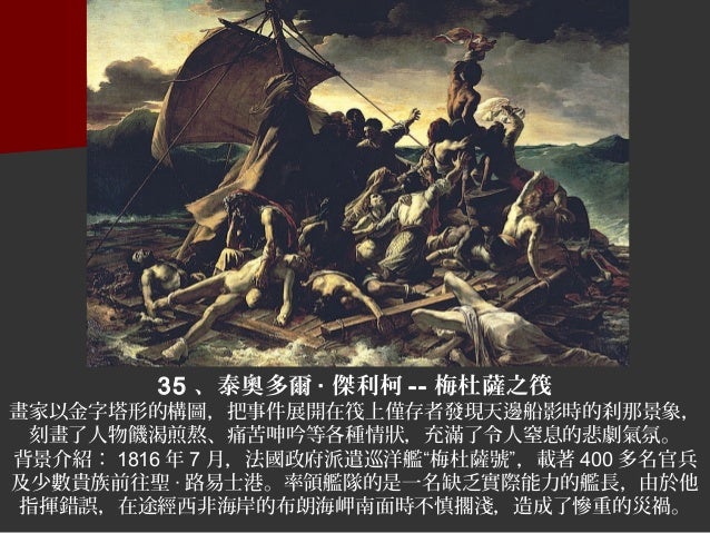 41. 41. 35 、泰奧多爾 · 傑利柯 -- 梅杜薩之筏 畫家以金字塔形的構圖,把事件展開在筏上僅存者發現天邊船影時的刹那景象, 刻畫了人物饑渴煎熬、痛苦呻吟等各種情狀,充滿了令人窒息的悲劇氣氛。 背景介紹: 1816 年 7 月,法國政府派遣巡洋艦“梅杜薩號”,載著 400 多名官兵 及少數貴族前往聖 · 路易士港。率領艦隊的是一名缺乏實際能力的艦長,由於他 指揮錯誤,在途經西非海岸的布朗海岬南面時不慎擱淺,造成了慘重的災禍。