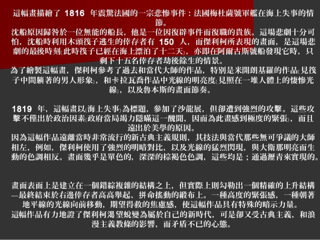 42. 42. 這幅畫描繪了 1816 年震驚法國的一宗悲慘事件:法國梅杜薩號軍艦在海上失事的情 節。 沈船原因歸咎於一位無能的船長,他是一位因復辟事件而復職的貴族。這場悲劇十分可 怕,沈船時利用木頭筏子逃生的倖存者有 150 人,而傑利柯所表現的畫面,是這場悲 劇的最後時刻 此時筏子已經在海上漂泊了十二天 ,亦即在阿爾古斯號船發現它時,只﹝ ﹞ 剩下十五名倖存者劫後餘生的情景。 為了繪製這幅畫,傑利柯參考了過去和當代大師的作品,特別是米開朗基羅的作品 見筏﹝ 子中間 著的男人形象 ,和 拉瓦喬作品中光線的明亮度 見照在一堆人體上的悽慘光躺 ﹞ 卡 ﹝ 線 ,以及魯本斯的畫面節奏。﹞ 1819 年,這幅畫以 海上失事 為標題,參加了沙龍展,但卻遭到強烈的攻 。這些攻﹝ ﹞ 擊 不僅出於政治因素 政府當局竭力隱瞞這一醜聞,因而為此畫感到極度的緊張 ,而且擊 ﹝ ﹞ 遠出於美學的原因。 因為這幅作品遠離當時非常流行的新古典主義規則,其技法與當代那些無可爭議的大師 相左,例如,傑利柯使用了強烈的明暗對比,以及光線的猛烈閃現,與大衛那明亮而生 動的色調相反。畫面幾乎是單色的,深深的棕褐色色調,這些均是;通過瀝青來實現的。 畫面表面上是建立在一個錯綜複雜的結構之上,但實際上則勾勒出一個精確的上升結構 —最終結束於右邊倖存者高高舉起、 命搖動的緞布上。一種高度的緊張感,一種朝著拼 地平線的光線向前移動,期望得救的焦慮感,使這幅作品具有特殊的暗示力量。 這幅作品有力地證了傑利柯 望蛻變為屬於自己的新時代,可是卻又受古典主義,和浪渴 漫主義教條的影響,而矛盾不已的心態。