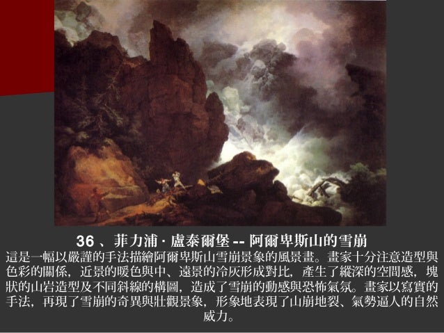 43. 43. 36 、菲力浦 · 盧泰爾堡 -- 阿爾卑斯山的雪崩 這是一幅以嚴謹的手法描繪阿爾卑斯山雪崩景象的風景畫。畫家十分注意造型與 色彩的關係,近景的暖色與中、遠景的冷灰形成對比,產生了縱深的空間感,塊 狀的山岩造型及不同斜線的構圖,造成了雪崩的動感與恐怖氣氛。畫家以寫實的 手法,再現了雪崩的奇異與壯觀景象,形象地表現了山崩地裂、氣勢逼人的自然 威力。