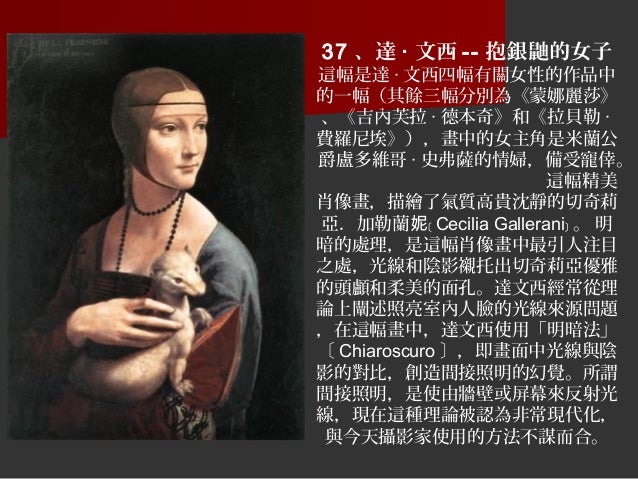 44. 44. 37 、達 · 文西 -- 抱銀鼬的女子 這幅是達 · 文西四幅有關女性的作品中 的一幅(其餘三幅分別為《蒙娜麗莎》 、《吉內芙拉 · 德本奇》和《拉貝勒 · 費羅尼埃》),畫中的女主角是米蘭公 爵盧多維哥 · 史弗薩的情婦,備受寵倖。 這幅精美 肖像畫,描繪了氣質高貴沈靜的切奇莉 亞.加勒蘭妮﹝ Cecilia Gallerani﹞ 。 明 暗的處理,是這幅肖像畫中最引人注目 之處,光線和陰影襯托出切奇莉亞優雅 的頭顱和柔美的面孔。達文西經常從理 論上闡述照亮室內人臉的光線來源問題 ,在這幅畫中,達文西使用「明暗法」 〔 Chiaroscuro 〕,即畫面中光線與陰 影的對比,創造間接照明的幻覺。所謂 間接照明,是使由牆壁或屏幕來反射光 線,現在這種理論被認為非常現代化, 與今天攝影家使用的方法不謀而合。