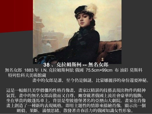 45. 45. 38 、克拉姆斯柯 -- 無名女郎 無名女郎 1883 年 I.N. 克拉姆斯柯依 俄國 75.5cm×99cm 布 油彩 莫斯科 特列恰科夫美術館藏 畫中的女郎是誰,至今仍是個謎,比蒙娜麗莎的身份還要神秘。    這是一幅頗具美學價 的性格肖像畫,畫家以精湛的技藝表現出物件的精神值 氣質。畫中的無名女郎高傲而又自尊, 穿戴著俄國上流社會豪華的服飾,她 坐在華貴的敞蓬馬車上,背景是聖彼德堡著名的亞歷山大劇院。畫家在肖像 畫上創造了一種新的表現風格,即用主題性的情節來描繪肖像,顯示出一個 剛毅、果斷、滿懷思緒、散發著青春活力的俄國知識女性形象。