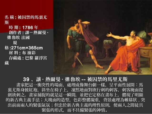 46. 46. 名 稱 : 被囚禁的馬裏尤 斯  時 期 : 1786 年  創作者 : 讓-熱爾曼 · 魯埃 法國德   規 格 :271cm×365cm  材 料 : 布 油彩  存藏處 : 巴黎 羅浮宮 藏 39 、讓 · 熱爾曼 · 魯埃德 -- 被囚禁的馬里尤斯   畫家把這一衝突性的場面,處理成像舞台劇一樣,呈平面性展開:馬 裏尤斯身披紅袍,斜坐在椅子上,凜然地面對欲行刺的刺客,刺客掩面提 劍欲刺之。畫家捕捉的就是這一瞬間,並把它定格在畫布上,體現了明顯 的新古典主義手法;大塊面的造型,色彩整體凝重,背景處理為帷幕狀,突 出前面兩人的緊張氣氛;但忠於新古典主義的理性原則,使兩人之間徒具 緊張的形式,而不具備緊張的神情。