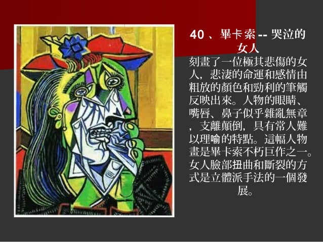 47. 47. 40 、畢 索卡 -- 哭泣的 女人 刻畫了一位極其悲傷的女 人,悲淒的命運和感情由 粗放的顏色和勁利的筆觸 反映出來。人物的眼睛、 嘴唇、鼻子似乎雜亂無章 ,支離顛倒,具有常人難 以理 的特點。這幅人物喻 畫是畢卡索不朽巨作之一。 女人臉部 曲和斷裂的方扭 式是立體派手法的一個發 展。