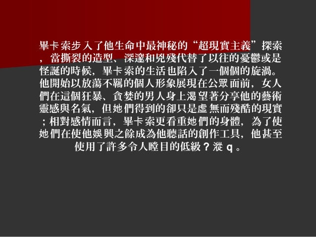 48. 48. 畢 索 入了他生命中最神秘的“超現實主義”探索卡 步 ,當撕裂的造型、深邃和兇殘代替了以往的憂鬱或是 怪誕的時候,畢 索的生活也陷入了一個個的旋渦。卡 他開始以放蕩不羈的個人形象展現在公 面前,女人眾 們在這個狂暴、貪婪的男人身上 望著分享他的藝術渴 靈感與名氣,但 們得到的卻只是 無而殘酷的現實她 虛 ;相對感情而言,畢 索更看重 們的身體,為了使卡 她 們在使他 興之餘成為他聽話的創作工具,他甚至她 娛 使用了許多令人瞠目的低級 ? 漎 q 。